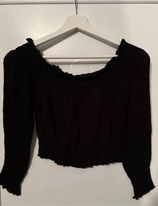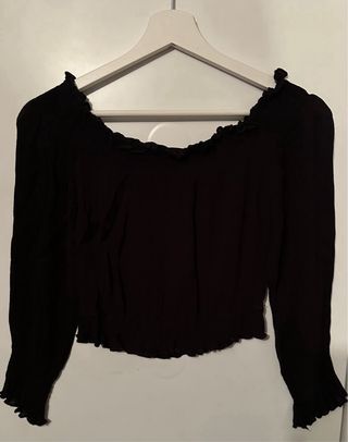 Blusa negra de volante. Hombro descubierto. Es elástica y tiene buena tela. Fresquita para verano. Talla M