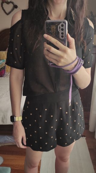 Conjunto de dos piezas de la marca Cuplé. - Blusa con hombros descubiertos y detalles. - Pantalón corto con estampado de flores.