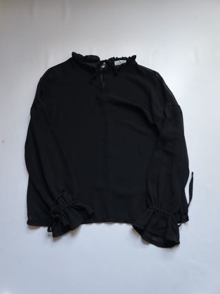 Elegante blusa negra con detalles de transparencia. Presenta un cuello con volantes y lazada. En buen estado - Mangas largas con puños fruncidos y lazada. - Tejido ligero y vaporoso.