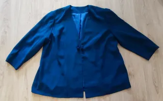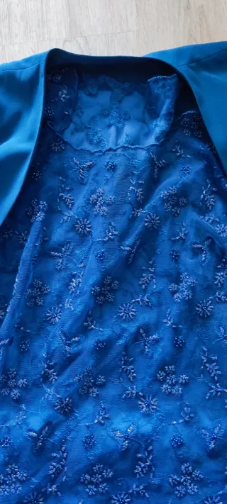 Elegante conjunto de tres piezas para ceremonias. - Chaqueta azul con dos botones en los mismos tonos del conjunto. - Blusa de manga corta transparente con detalles de encaje y pedrería. - Falda con cremallera lateral y abertura en la parte central bajera. La cintura estirada mide 1,23. - La chaqueta y la falda están forradas. Puesto en un par de ocasiones. No sé calcular la talla pero mínimo para una 54-56...