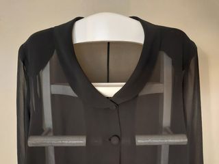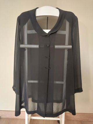 Elegante blusa negra de gasa transparente con botones talla 46 bastante amplia, para dar vuelo. Nuevo, usado para una boda. No tiene ni un defecto. Ideal para eventos, ceremonias, etc....