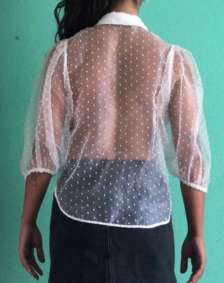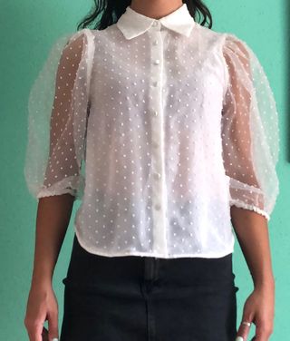 Elegante blusa con un diseño de transparencia en las mangas y el escote, adornada con lunares. - Mangas largas con tejido de malla y lunares. - Cuello camisero. - Cierre de botones frontales. - Detalle de lorzas en el pecho para adaptar mejor