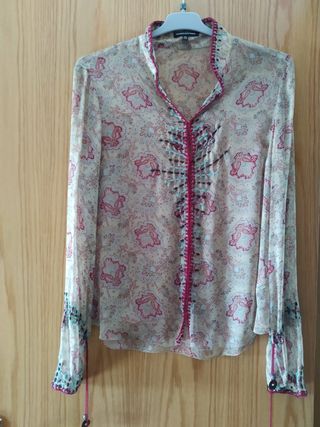 Blusa de mujer de la marca Desigual. Transparenta un poco. Tiene gomilla a la altura de la cadera-cintura, tiene botones en toda la parte frontal y en los puños. Precio negociable.