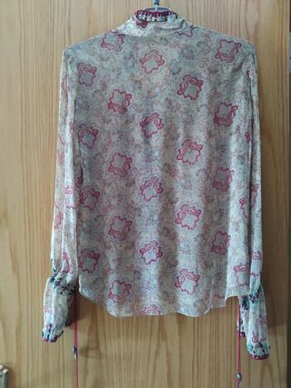 Blusa mujer Massimo Dutti. Transparenta un poco. En la parte frontal tiene cierre con corchetes, a la altura de los puños tiene una cuerda para ajustar y colgando unas monedas. Talla 40 (ESP). precio negociable. de seda.