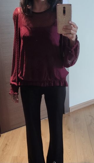 Camisa color burdeos talla 38 con zona de nido de abeja en caderas y puños. Fina. Semitransparente en brazos y zonas superior del pecho, pero no transparenta el sujetador. No se arruga. Usada en tres ocasiones. Sin defectos ni manchas. Mide 58 cm de largo 45 cm de axila axila y 40cm de cintura, pero puede dar 10cm más de talla porque es elástico