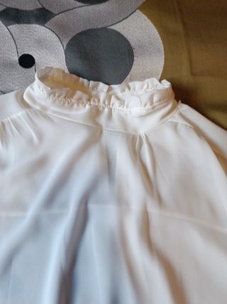Blusa blanca preciosa, manga abullonada. Transparente pero con un bralete queda preciosa. Talla como una M. Es ancha