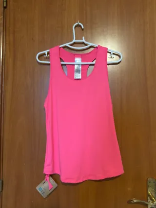Blusa rosa de corte deportivo, ideal para actividades o uso casual. No se ha utilizado ni una sola vez, el color real es más cercano a las 2 primeras imágenes. - Diseño sin mangas. - Cuello redondo. - Etiqueta de marca en el interior.