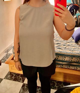 Blusa gris de corte clásico y elegante. - Diseño sin mangas. - Tejido ligero y fluido. - Talla S Prácticamente nueva, quiero darle una nueva vida.