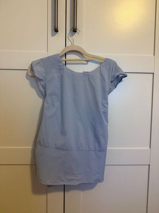 Blusa atrevida y elegante de la marca Mango, color azul eléctrico/azafata. Pone tallas S pero es tipo oversize (como una talla M, 38-40) - Diseño original, cruzado a la espalda, con cierre con corchetes y cuello camisero (corta por delante y larga detrás). - Manga larga y abotonada, se puede doblar. - Tejido con brillo sutil.