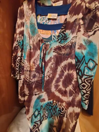 Blusas con un diseño vibrante y llamativo. - Estampado tipo tie-dye con detalles geométricos. - Escote en V con cordones. - Mangas cortas. - Tejido ligero y fluido. 20 euros cada una