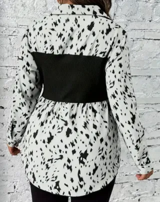 Elegante blusa de mujer con un diseño moderno y llamativo. - Estampado de leopardo con manchas en blanco y negro. - Diseño de corte tipo corsé en la parte superior, elástico. Muy favorecedor - Mangas largas. - Talla 48 equivalente a una XL - XXL Camisa - vestir - ocasión - fiesta