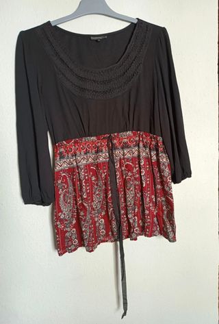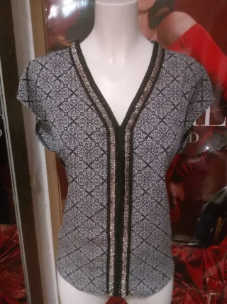 Preciosa blusa fluida de la marca H&M, con un elegante estampado de inspiración bohemia y oriental. La parte frontal tiene motivos multicolor muy refinados, mientras que las mangas y la espalda son de tejido negro ligero y ligeramente transparente, lo que le da un toque muy femenino y sofisticado. Detalles: • Marca: H&M • Talla indicada: S 👉 También puede servir para una M gracias a su corte fluido • Color: Negro y multicolor • Material: Tejido fluido, ligero y agradable al tacto • Ancho de sisa: 51 cm • Largo: 57 cm • Mangas: 3/4
