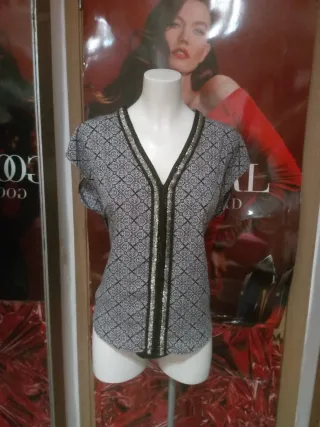 Blusa/camisa de mujer marca Mango, en color negro con manchitas blancas, un estampado clásico y fácil de combinar. Talla S. Es una prenda muy versátil: perfecta para looks de trabajo combinada con pantalón sastre o falda, y también fácil de estilizar para salir con jeans o accesorios más llamativos. Corte favorecedor y estilo atemporal, ideal para tener como básico elegante en el armario. Marca: Mango Talla: S Color: Negro con estampado blanco Estilo: Casual elegante / oficina / salida