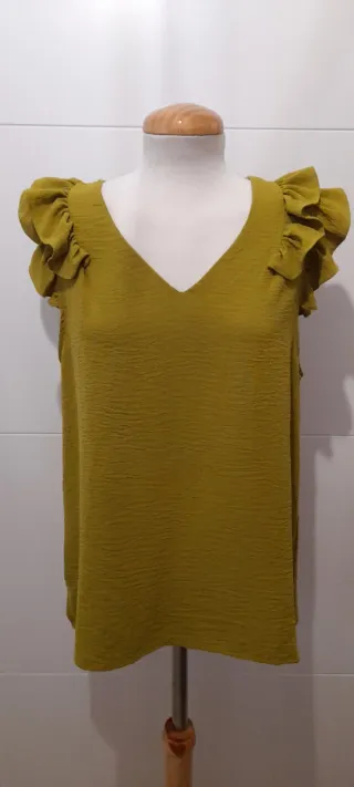Blusa de verano con un diseño moderno y detalles de volantes en las mangas. Creo que es más bien una talla L. - Escote en V. - Mangas cortas con volantes. - Tejido con textura. Ver fotos para medidas.