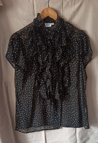 Elegante blusa de gasa con un delicado estampado de lunares y detalles de volantes. Solo se ha usado una vez. - Diseño con cuello alto y volantes delanteros. - Mangas cortas con acabado fruncido. - Tejido ligero y vaporoso.