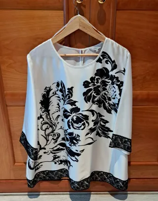 Blusa de mujer muy elegante, con un solo uso para una celebración. Talla XXL, cómo para una 52/54. - Diseño con estampado floral en negro sobre fondo blanco. - Detalle de encaje en puños y bajo. Manga francesa.