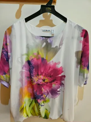 Blusa de manga corta con un vibrante estampado floral. - Diseño con flores en tonos fucsia, morado y verde. - Tejido ligero y vaporoso. - Cuello redondo. Tiene una pequeña mancha en el lado izquierdo