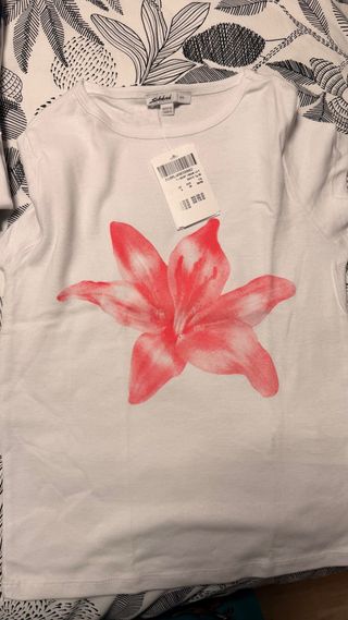 Blusa de manga corta con un bonito estampado floral. Por detrás tiene una fina tela de camiseta, por delante con caída. Tiene dos tiras laterales para hacer lazada. Es monísima y no la llegué a estrenar. - Diseño con lazada lateral. - Tejido ligero y vaporoso.