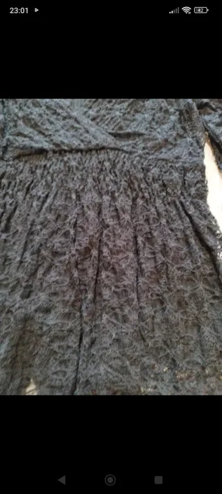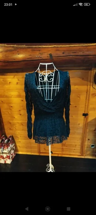 Elegante blusa negra con un diseño de doble capa que crea un efecto visual muy favorecedor. - Detalle de encaje en la parte frontal y espalda. - Corte que realza la figura. - Sin mangas. Lleva elástico en la cintura, quedando debajo una especie de volante que disimula tripita. Es ligeramente más larga por el centro. Es una talla L algo elástica, válida para XL. Para 2XL, mejor comprobar medidas ⬇️ - Axila a axila: 50 cm, estira hasta 53 - Cintura: 40 cm, estira hasta 46 - Volante: 53 cm - Largo lateral: 62 cm - Largo centro: 68 cm *No me puedo trasladar, sólo envío o recogida en mi domicilio. **Descuento por lote**