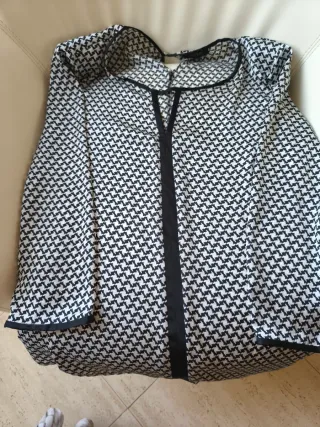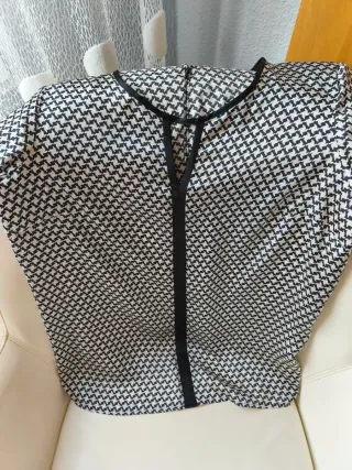 Elegante blusa con un estampado clásico en blanco y negro. Perfecta para añadir un toque sofisticado a tu vestuario. Moderna y actual comprada en El corte inglés puesta solamente una o dos veces están muy rebajadas se venden 10 euros solamente costó 55 - Diseño con cuello redondo y detalle de ribete. - Manga larga. - Estampado tipo pata de gallo.