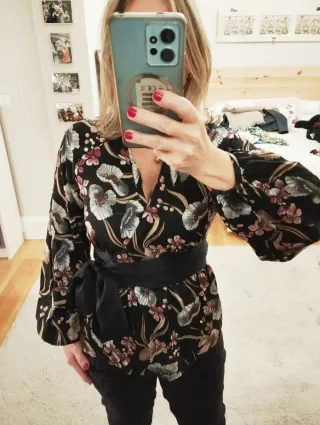 Elegante blusa de seda con estampado floral y cinturón. - Se cierra adelante y se ata a un lado con el lazo que hace de cinturón. - Diseño cruzado. - Mangas largas abullonadas. Queda muy bonita puesta. Talla pequeña (equivale a una XS). Medidas aproximadas en las fotos.
