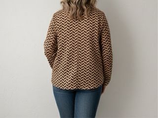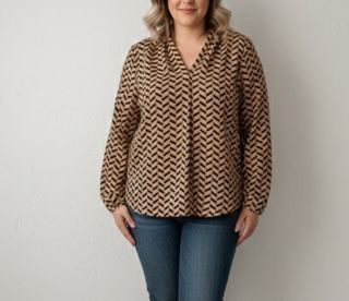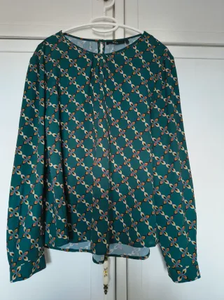 Blusa de manga larga con estampado de espiga/zigzag en tonos camel y negro. Es una prenda muy versátil, ideal tanto para ir a la oficina con unos pantalones de vestir como para un look casual con vaqueros (como se ve en las fotos).para la talla 42 Queda perfecta, ni muy justa ni muy suelta. Aunque da más talla comprobar medidas porque seria psra una 44 como pongo en el anuncio Escote en pico (femenino y estiliza mucho) y corte recto que no marca. La Tela es ligera, suave al tacto y que apenas se arruga En perfecto estado, muy poco uso está perfecta medidas de sisa a sisa 54 cm de largo 63 de hombro a hombro 42 cm