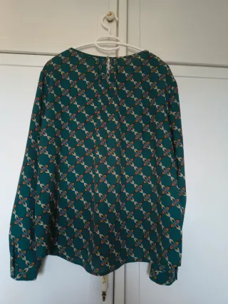 Blusa de Cortefiel con un bonito estampado. - Diseño con cuello anudado y volantes. - Manga larga con puños acampanados. - Bajo elástico con detalle de volante. -Tejido traslúcido muy fluido Marca talla L, pero se ajusta mejor a una M