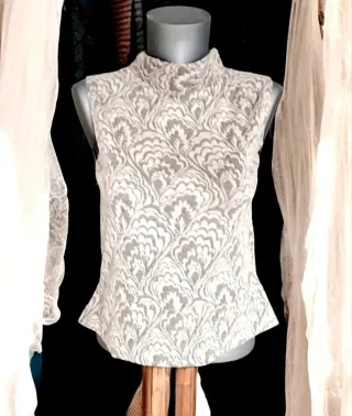 Blusa sin mangas con un diseño texturizado y ligeramente elástico. Tiene una compostura para reducirla de largo. Lo puedes ver en la última foto. - Cuello alto. - Estampado de estilo damasco. - Tejido con relieve.