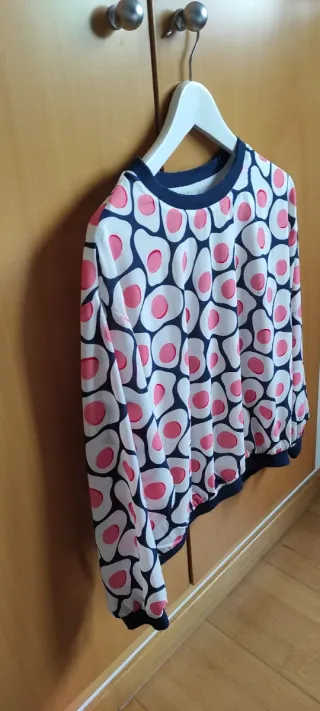Blusa de manga larga con un divertido estampado tipo huevos fritos. Es una S amplia. - Diseño con círculos blancos y rosas sobre fondo azul marino. - Cuello redondo y puños y bajo elásticos. - Tejido que no se arruga y lavable a máquina. Muy vaporosa. - Usada puntualmente. #blusamujermangalarga #blusamujer #blusaoriginal #blusaminueto