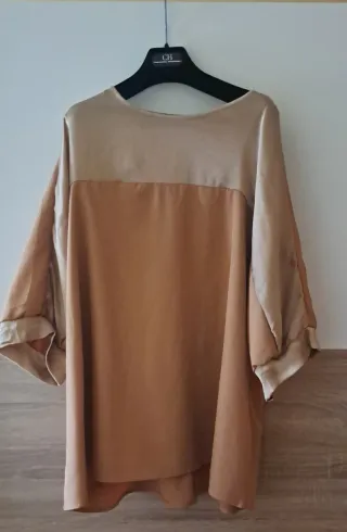 Blusa elegante con un diseño de bloques de color. - Combinación de tonos beige y marrón. - Cuello redondo. - Medidas pecho 146, largo 77, largo manga 52. - Usada una sola vez.