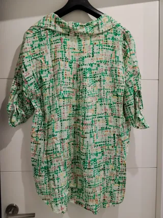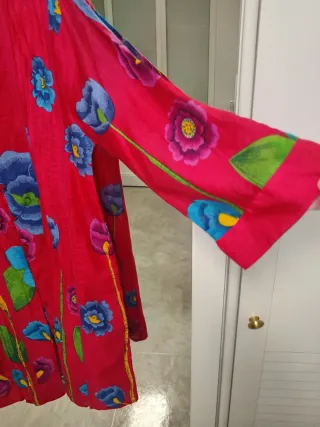 Preciosa blusa finita en colores verde amarillo rosa y rojo. Manga tres cuartos y se puede hacer de manga corta con el botón como se ve en la foto. Es talla única pero es bastante amplia por lo que corresponde a una L o XL. Adjunto medidas. Perfecto estado. Un solo uso. Envío rápido. Sólo hago envíos