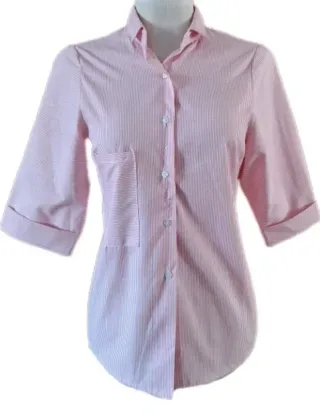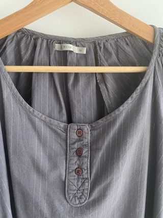 Blusa de manga tres cuartos con un diseño elegante y detalles sutiles. Marca Easy Wear (El Corte Inglés), talla 36. Da más talla, también vale para una persona con talla 38. Composición: 98% algodón y 2% lurex. Vendo por no uso. - Raya plateada vertical y diagonal. - Cuello redondo con abertura y botones. - Mangas abullonadas con puño elástico. Muchos artículos en perfecto estado en mi perfil. Pactamos precio si llevas varias cosas. No hago envíos, solo entrega en mano.