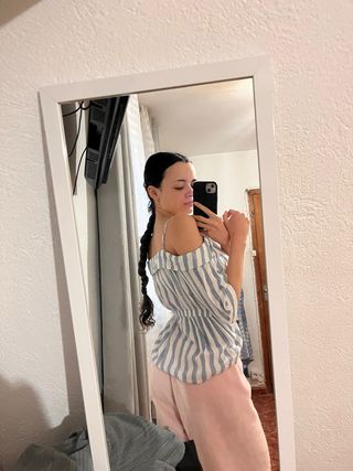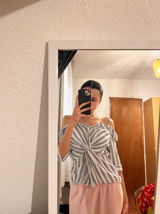 Blusa ajustada con diseño de rayas azules y blancas. Presenta un estilo moderno y fresco. En el centro de la prenda hay un efecto de giro de la tela, que abre en dos la parte del ombligo, quedando elegante y bonito a la vez. Además, en la parte de detrás tiene una goma que ajusta la cintura. Aunque sea la M, también sirve como más pequeña, ya que a mí me queda perfecta y uso S - Diseño de hombros descubiertos. - Detalle de nudo en la parte frontal. - Mangas tres cuartos.