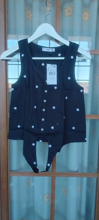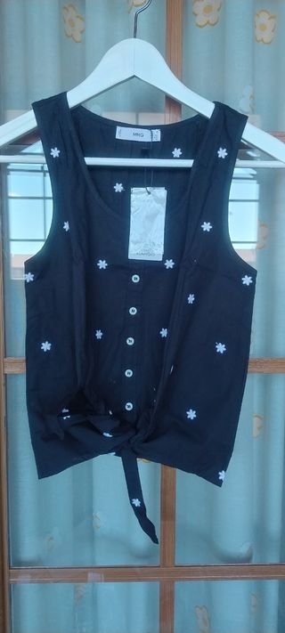 Blusa sin mangas de algodón de Mango. Con detalles de flores bordados y para anudar en la parte de abajo. Sin usar, está tal cual me vino. Talla XS que puede valer a una S