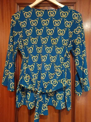 Elegante blusa de manga 3/4, estampada, con lazo en la espalda. - Diseño de cadena en dorado sobre fondo azul. - Cuello redondo. - Mangas 3/4 - Lazo en espalda - En perfecto estado (se ha usado solo una vez)