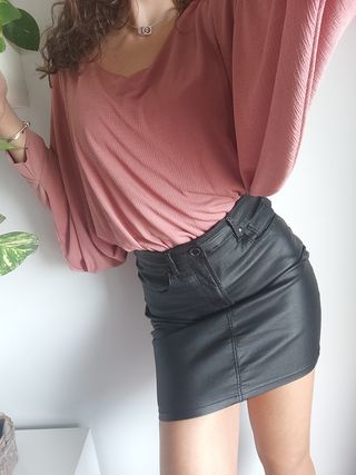 Blusa granate/burdeos, marca Bershka, talla M. El cuerpo y las mangas son de una tela con relieve tipo "nido de abeja" o gofre, mientras que la parte de la espalda y los laterales son de un tejido fluido tipo gasa, lo que hace que tenga una caída muy bonita y no marque nada. Tiene manga francesa (3/4) y el corte es un pelín más largo por detrás que por delante, ideal para llevar con leggings o vaqueros ajustados. Tiene una pequeña mancha por detrás debajo de una manga (ver última foto).