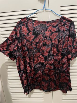 Blusa con un llamativo estampado floral. No pone talla. Al menos es una L - Diseño con hojas y flores. - Tejido con textura aterciopelada. - Manga corta. - transparencias Precios negociables si compras algún producto más de mi perfil.
