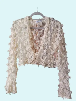 Elegante blusa de encaje con un diseño floral y detalles en relieve. Es una prenda delicada y con un estilo único. - Diseño de manga larga. - Cierre frontal con cordones. - Acabado festoneado en el bajo.