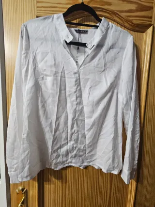 Blusa blanca de manga larga con detalles de encaje. - Tejido ligero y vaporoso. - Escote en V con detalles de puntilla. - Mangas largas con puños abullonados y encaje. - Bajo asimétrico. La he usado una vez. Muy bonita y combinable. La vendo porque no la uso