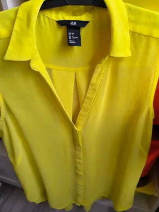 Camiseta de tirantes de la marca H&M en un llamativo color amarillo. Su diseño es ligero y fresco, ideal para el buen tiempo. Usada dos veces. Tiene una diminuta marca que no se nota nada puesta, muestro en ultima foto. - Cuello camisero. - Cierre de botones en la parte delantera escondidos.