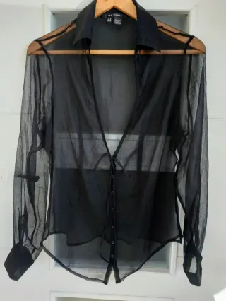 Elegante blusa de manga larga en color negro. Presenta un detalle de encaje en la espalda y botones frontales. Pone talla 36 pero da bastante talla como una 38. De hombro a hombro mide 38 cm y de largo 68 - Cuello redondo con abertura. - Mangas largas con puño. - Cierre de botones en la parte delantera. - Detalle de encaje en la zona de la espalda. Descuento del 10% en dos o más artículos de mis anuncios y 25% a partir de 5