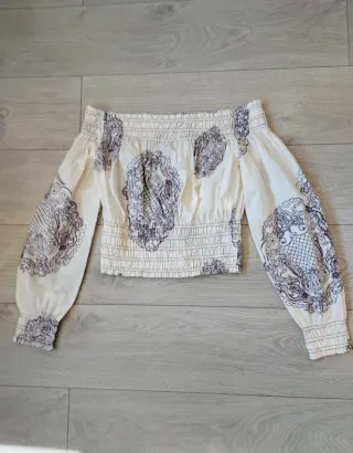 Blusa en color crema de algodón con bordados morados y hombros descubiertos, de la firma Zara, talla M-L, tiene un estilo romántico con mangas largas y un diseño de estampado floral. - Es una prenda elegante y versátil, ideal para cualquier ocasión. - Se encuentra en perfecto estado. - Un único uso. Medidas: Largo 41cm Largo manga desde la sisa 50cm Ancho hombros 46cm extensible a 82cm Ancho cintura 35,5cm extensible 61cm Hago envío, también se puede recoger en calle Jaime el Conquistador (28045, cerca de los metros Legazpi y Delicias).
