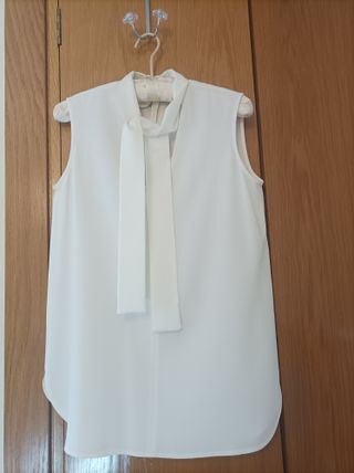 Elegante blusa sin mangas con lazada a modo de foulard para anudar a cuello u hombro. - Tejido satinado con un acabado brillante. - Top de corte recto y favorecedor. - talla más amplia q una xs convencional: de sisa a sisa 50cm. Largo espalda 68 . Hombro 18 - Ideal para ocasiones especiales o para elevar un look casual.