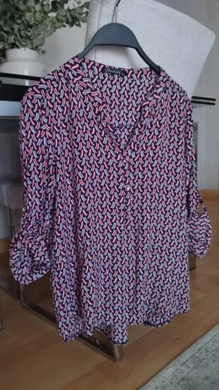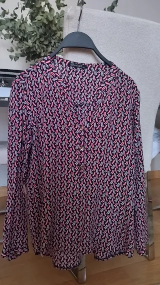 Blusa de manga larga con estampado geométrico y botones dorados. Es una T/40 en etiqueta pero talla menos, siendo perfecta para tallas 36 y 38. Perfecto estado - Diseño con cuello en V y manga larga. - Cierre de botones dorados en la parte frontal. - Estampado geométrico.
