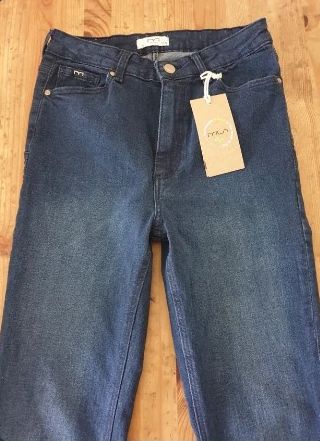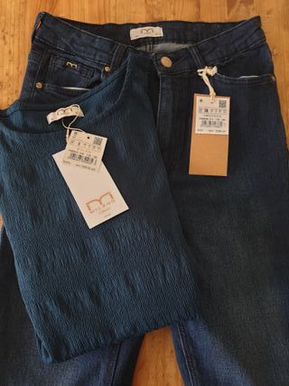 Lote de 2 prendas Milano, nuevas con etiqueta. Vaquero talla 38. Modelo Flare Fit. Tejido elástico. Medidas: cintura 33 cm, total cintura 77 cm, largo interior 78 cm, largo exterior 104 cm. Composición: 99 % algodón, 1 % elastano. Bajo cortado. Pequeño defecto de fabricación en parte posterior (se aprecian en la última foto). Camiseta talla S. Color azul marino. Tejido con textura. Tejido elástico. Goma en las mangas. Hombros caídos. Composición: 95% poliéster, 5% elastano. Es amplia, no entallada. Puede valer para una talla M.