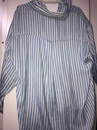 Blusa de Sfera con un diseño de rayas verticales en tonos azul y blanco. Es una prenda versátil y cómoda. - Cuello camisero. - Cierre de botones. - Manga larga.