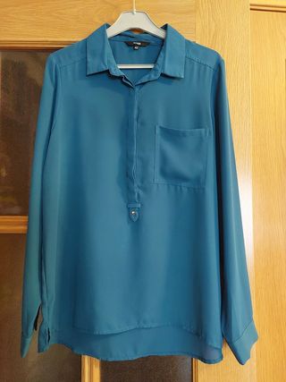Camisa tipo blusa, de gasa en un bonito tono verde agua, con tacto seda. Su tejido ligero la hace ideal para cualquier ocasión. .Impecable Talla XS, pero sirve para una S también porque es amplia. - Manga larga. - Cuello redondo.
