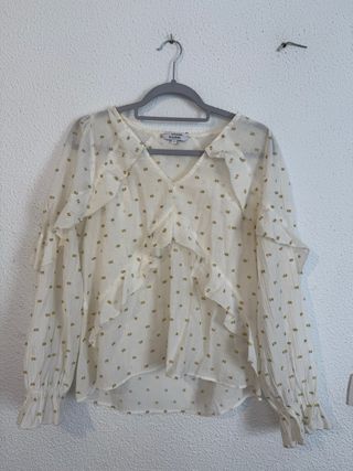 Elegante blusa de Scalpers con un diseño delicado. Solo la use una vez - Tejido ligero y vaporoso. - Estampado de pequeños cuadros dorados. - Volantes decorativos en la parte delantera. - Mangas largas con puños fruncidos.