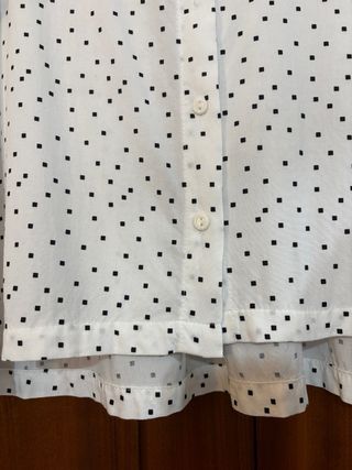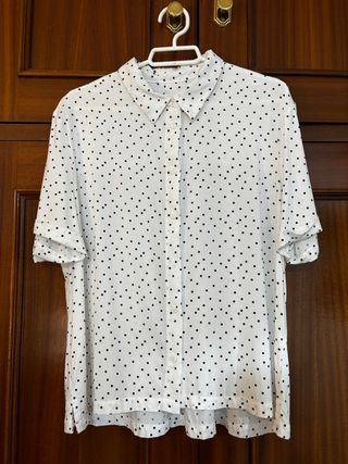 Camisa de manga corta con un divertido estampado de puntos negros sobre fondo blanco. Es una prenda ligera y versátil. Completamente nueva, sin ningún uso. - Diseño de puntos cuadrados. - Cuello camisero. - Cierre de botones.