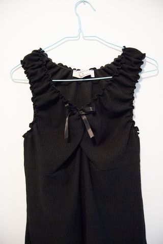 Top de punto negro con detalle de volantes en los hombros y un coqueto lazo en la parte delantera. - Tejido de punto con textura. - Diseño sin mangas. - Volantes elásticos en escote y mangas. - Lazo decorativo central. Vestido negro de punto con textura acanalada, ideal para cualquier ocasión. Presenta un elegante diseño sin hombros con volantes fruncidos en el escote que le dan un toque romántico y femenino. Incluye lazo decorativo en la parte delantera. Detalles: Talla: S Marca: Primark Color: Negro Material: Punto acanalado suave y elástico Estado: [Indica aquí: nuevo con etiqueta/como nuevo/buen estado] Perfecto para combina